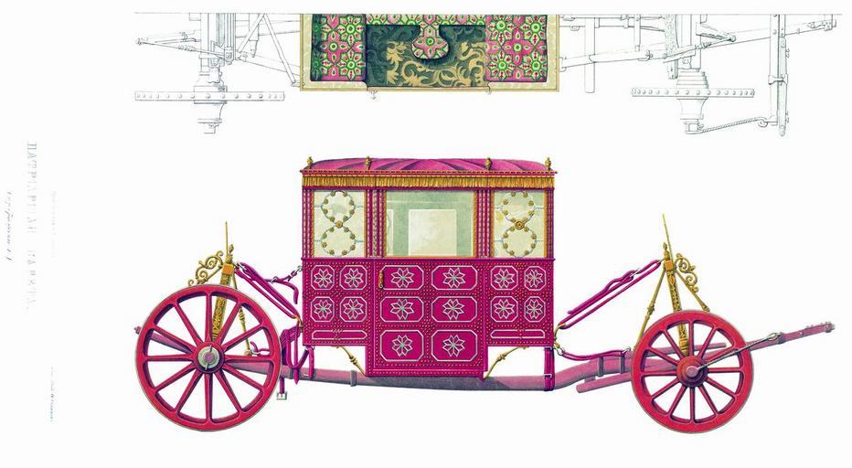 | Keywords: Drevnosti RG v3 ill137.jpg ru Пат иа шая ка ета изоб ажение 1 По п еданию бывшего Колымажного дво а эта ка ета называлась пат иа шею; по описи 1706 г она поступила в конюшенную казну после «Боя ина икиты Ивановича Романова» и следовательно должна была п инадлежать пат иа ху Фила ету икитичу В 1688 г она пе еделывалась для вст ечи Г узинского ца я Тему уза Тейму аз Описание этой ка еты в 1706 г с п ежних пе еписных книг следующее «Ко ета ба хотная с голунами све ху и по сто онам и две и обиты ба хатом че вчатым гладким; в ней над Госуда евым местом к ест се еб яной чеканной золоченой; над боя ским местом к ест се еб яной езной золоченой; по ве ху на ко ете возле каймы к уживо кованое се еб яное ши окое; по ка ете п ибивано месты голуном се еб яным; на ко ете одиннадцать маковиц железных золоченых; по кайме све ху около ко еты п ибиваны гвозди медные гладкие золоченые а под ними п ибито бах ама золотная гвоздьми гладкими малыми золочеными; в ко ете и в две ех восемь окончин слюденых станки писаны сусальным золотом; в две ех под окончинами две подставки медные золоченые на тесьмах шолковых; около окончин по две ям и под окончинами по ко ете и по столпцам п ибиван голун се еб яной гвоздьми медными золочеными; ниже окончин п ибито гвоздочками маленькими в се етках меж голуна нашиваны епьи таким же голуном; п омеж епьев по столбцам набивано гвоздьем медным золоченым; в ко ете вве ху и по столпцам и две и обиты ба хотом золотным епейчатым; п омеж золотных епьев епьи се еб еные с шолком че вчатым да с зеленым; вве ху в с едине к уг около к уга бах ама золото п яденое с се еб ом; в ко ете ж под ве хом бах ама шолк зелен золотом по ба хоту; ве х и по сто онам п ибиван голун се еб еной гвоздьми медными золочеными; на местах подушка того ж ба хоту; у мест по к аю бах ома золото п яденое; в исподи у места ж обито кожею золотною; у две ей в п итво е по к аем обито обья ью се еб еною по ней т авки золотные шолки озных цветов; посто онними месты в исподи два тюшечка пок ыты сукном че вчатым; столпцы пе едние и задние де евянные езные золоченые золотом и се еб ом сусальным; оттужины и подпо ы и поясы п яжи и петли железные золоченые; напе еди и назади ка еты ж меж столпцов на впо ках п ибито железо п о езное на нем езаны зве и и т авы на обе сто оны золочено сусальным золотом на столпцах четы е маковицы железные золоченые; подъемные поясы обшиты ба хотом по них голун се еб яной; стан и колеса обиты железом чехол суконной к асной Взята та ко ета после боя ина икиты Ивановича Романова во k`д году 1656 а пе еделана та ко ета для вст ечи Г узинскаго Ца я Тему уза во k`з году 1658 А по пе еписи с` года 1692 та ко ета с п ежнею пе еписною книгою ч`з года 1689 сходна А по нынешней пе еписи j`з года 707 та ко ета с п ежнею пе еписною книгою с` года 1692 сходна а по осмот у у той ко еты к естов се еб яных да двух тюшачков пок ытых сукном нет; цена той ко ете сто семьдесят ублев» Д евности Российского госуда ства http //john-petrov livejournal com/1190678 html Солнцев Фёдо Г иго ьевич < 1853 PD-old Antiquities of Russian country - Volume III Files uploaded by Shakko from various sources Carriages in Russia Patriarch Filaret's items |