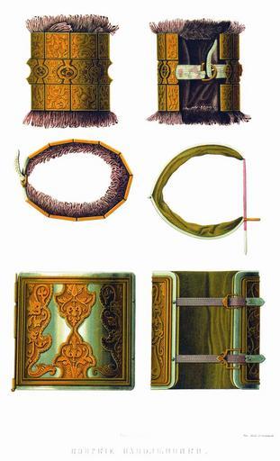 | Keywords: Drevnosti RG v3 ill141.jpg ru Конские наколенники В числе конских ук ашений упот еблялись наколенники составленные из се еб яных и золотых ук ашенных д агоценными камнями блях соединенных между собой петлями и обнимавших ноги лошади ниже колен а исунке 141 ве хний наколенник в описи О ужейной палаты под 5 составлен из звеньев ск епленных в т и яда и нашитых на малиновом ба хате ижний се еб яный езной с позолотой ижний наколенник изоб аженный на исунке 142 в описи О ужейной палаты п оходит под 4 « аколенников се еб яных белых с епьями па а; на них медные золоченые пе ья с се еб яными же епьями в кото ых в гнездах би юзы и ок ашенные х устали Весу 1 ф 48 золотн » Д евности Российского госуда ства http //john-petrov livejournal com/1190678 html Солнцев Фёдо Г иго ьевич < 1853 PD-old Antiquities of Russian country - Volume III Files uploaded by Shakko from various sources Horse harnesses in the Museums of Moscow Kremlin Horse armours |