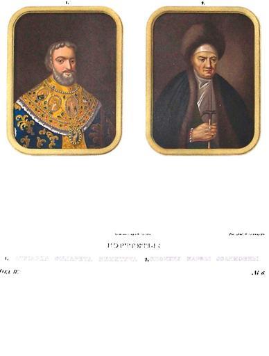 Keywords: Drevnosti RG v4 ill006.jpg ru Д евности Российского госуда ства Antiquities of Russian country 1846 1853 Том 4 Иллюст ато ru Солнцев Фёдо Г иго ьевич По т еты А пат иа ха Фила ета икитича Б инокини а фы Ивановны Оба сии по т ета помещенные г Бекетовым в соб ании по т етов знаменитых оссиян 1821 давно уже выдаются за изоб ажения одоначальников ца ственного дома Романовых пат иа ха Фила ета икитича в ми е боя ина Федо а икитича и его суп уги великой ста ицы а фы Ивановны из ода Шестовых Их лиценаче тания должны быть д агоценны для всякого усского хотя бы они п едставляли какое-нибудь сходство с этими исто ическими лицами Подлинники с коих сняты сии по т еты х анятся в московской О ужейной палате; они писаны на холсте в конце XVIII столетия когда по догадкам и п едположениям не едко давали неподписанным по т етам п оизвольные названия и когда азные утва и п иписывали то одному то д угому знаменитому лицу а об атной сто оне пе вого по т ета написано по холсту че нилами позднейшего поче ка Пат иа х Фила ет икитич а под ним имя художника А Ант опов 1772 года После сего кажется никакому сомнению не подлежало бы имя изоб аженного лица если бы не п отиво ечила его одежда и утва и авно как и несходство с д угими по т етами сего пат иа ха Фила ет изоб ажен в ца ской утва и а аменах его ба мы ук ашенные д обницами д агоценными камнями и жемчугом и опушенные го ностаевым мехом а нем кафтан с золотным к ужевом по аспашке а пе сях у него панагия с изоб ажением Богомате и какую иногда возлагали на себя и ца и вместо к еста а голове у него нет ни святительской мит ы ни клобука с какими обыкновенно писаны были пе восвятители о что всего удивительнее волосы на голове бо ода и усы подст ижены воп еки п авилам и обычаям Хотя пат иа хи и поновляли волосы на голове как значится в делах их П иказа однако ве оятно только гуменце согласно с обычаями г еческих священнослужителей и с п авилом Ко мчей книги «главу да подст игают екше сущее на главе гуменце» Итак пат иа х Фила ет хотя и соп авитель и отец ца я не мог быть изоб ажен в ца ской утва и а тем более с подст иженной бо одой и усами Сличая это изоб ажение с по т етами Г узинских ца ей А чила и И аклия в селе Лыскове у князя Е А Г узинского у ца евича И Г Г узинского в Кусковской ка тинной гале ее у г афа Ше еметева находим между ними в на яде и даже в общих че тах лица такое сходство что по т ет выдаваемый за Фила етов одинаков с изоб ажением одного из ца ей Име етинских Хотя на обо оте по т ета в Кусковской гале ее сове шенно похожего на п иложенный здесь написано по холсту ста инным поче ком «Фила ет икитич Пат иа х осковский отец Ца я ихаила Федо овича» но слова сии заче кнуты и под ними написано Ца ь Г узинский а на я лыке п и ка тине читаем «По т ет Ца я Г узинского И аклия» Если это А чил как полагает у авьев то он известен в оскве потому что в 1683 г п инятый со всем одом в подданство оссийское он п иезжал к ца ю осковскому Если же то действительно И аклий как значится и в надписи и в домовой описи то он замечателен для нас тем что начав ца ствование свое в 1744 г в последний аз соединил Кахетию с Ка тали-нией и считался подданным Российского госуда ства Как бы то ни было только это не по т ет пат иа ха Фила ета как обна уживает и самая одежда По т ет в Кусковской гале ее не поясной как в О ужейной палате но почти коленчатый; шуба на нем подбитая мехом надета в аспах Сличая на яд его с