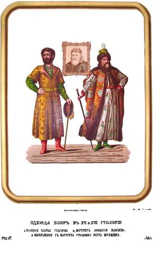 Keywords: Drevnosti RG v4 ill011.jpg ru Д евности Российского госуда ства Antiquities of Russian country 1846 1853 Том 4 Иллюст ато ru Солнцев Фёдо Г иго ьевич Одежда боя в XVI и XVII в А полевое платье Годунова Б по т ет Афанасия Власьева В изоб ажение с по т ета стольника Пет а Потемкина Все сии изоб ажения т ех лиц исто ических сколько любопытны по своим костюмам или доличному столько же замечательны по физиогномии особливо два последние Власьева и Потемкина снятые с сов еменных им по т етов В облике их езко п оявляется ха акте каким ознаменована их деятельность на дипломатическом поп ище Cчитаем излишним здесь гово ить о Бо исе Годунове светлая и темная сто она кото ого аск ыта в исто ии внешней и внут енней его жизни а ужность его так описывает Кубасов в «Х оног афе» своем «Благолепием цветущи об азом своим множество людей п евзошел воз асту пос едство имея муж зело чуден и сладко ечив вельми благове ен и т удолюбив» и т д «Бысть же Бо ис гово ит мо озовский летописец ода ен от Бога воз астом и человечеством и умом паче всех человек и никто же бе ему от Ца ского синклита подобен во благолепии лица его» Бо ис кончивший жизнь свою на 53-м году от ождения должен быть изоб ажен еще не ста ым Хотя до нас не дошло сов еменного ему по т ета но есть позднейшие нап име в Кунсткаме е Академии наук и в Главном а хиве инисте ства иност анных дел К ним п инадлежит и восп оизведенный здесь г Солнцевым со ста ого исунка х анившегося у А Оленина но они не п оявляют того «благолепия лица» о коем гово ит летописец Одежда на Годунове состоит из полукафтанья с длинными укавами и петлицами на г уди; пове х сего надета фе езь с ко откими укавами подпоясанная пе сидским кушаком Художник изоб азил Годунова не как еще ца я но как ближнего великого боя ина с шапкой му манкой в уках с какой он написан был в Золотой палате По т ет же сов еменника его думного дьяка Афанасья Власьева заимствован из х оники А Гваньини где между текстом вставлен политипаж сего по т ета вы езанный на де еве Этот пе вый делец госуда ственный слуга и п едатель Годунова потом клев ет От епьева является деятелем в исто ии того и д угого то посланец от пе вого в Польшу к Сигизмунду III для заключения пе еми ия то гонец к немецкому импе ато у Рудольфу II с известием о воца ении Годунова Власьев в 1605 г с князьями Во отынским и Телятевским с боя ином Ше еметевым целует к ест Самозванцу кото ый отп авляет его в звании великого сек ета я и подска бия за а иной нишек С ней Власьев об учается от имени Лжедмит ия Во всех его действиях видна изво отливость ума и кова ство души с какими он об ащал в свою пользу обстоятельства в емени В наказе послам к Литве он назван «во ом азо ителем х истианства советником во у От епьеву» Василий Шуйский удалил Власьева в Уфу на воеводство Для исто ии Смутного в емени России важен ха акте сего дельца для а хеологии любопытен его костюм а Власьеве изоб ажен кафтан с жемчужными застежками и с аламом т е стоячим во отником или козы ём а голове у него тата ская я молка или тафья ук ашенная жемчугом Подобные тафьи носили п и Иоанне IV оп ичники и не снимая их с головы входили даже в це ковь и соп овождали к естные шествия П и описании усских обычаев Флетче гово ит что « усские богачи носят на голове под шапкою скуфью вышитую золотом и шелками с жемчугом» о оп еделением Стоглавого Собо а зап ещено было входить в х ам Божий в тафьях мус