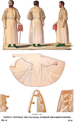 | Keywords: Drevnosti RG v4 ill017.jpg ru Д евности Российского госуда ства Antiquities of Russian country 1846 1853 Том 4 Иллюст ато ru Солнцев Фёдо Г иго ьевич Одежда боя ская XVII в Ут енний шелковый кафтан Хотя в надписи одежда сия и названа ут енним летним кафтаном но ве оятнее она п инадлежит к фе езям коих мы коснулись анее Фе езь была мужской и женской одеждой; сходная с ней у г еков вст ечается «исподнее платье» по пе еводу Гнедича « иза»; по Рейфу «фе ез» п оисходит от ту ецкого «плащ» В ста ину у усских на ядные са афаны назывались фе езями кои были теплые и холодные Пок ой и ме у фе ези так описывает нам К оильная книга с 7139-го по 7146 г «Ск оены Госуда ю фе ези тафта ала виницейска взята с Казеннаго дво а длина фе езем два а шина ши ина в плечех а шин с ве шком в подоле ши ина т и а шина два ве шка укава длина полто а а шина в ко ени восемь ве шков в запястье ши ина т и ве шка» Из этого видно что фе езь азнилась от кафтана станом и укавами кои у ней были бо истые в ко ени ши е а к запястью уже Фе ези теплые и холодные заменяли кафтаны кои как известно из К оильных книг бывали становые ездовые ве хние и нижние дождевые с нашивками то очковыми шелковыми с золотом Они ук ашались завязками с кистьми и об азцами или к угами кои низаны были по ба хату жемчугом и до огими каменьями К ним п истегивались аламы или во отники стоячие и лежачие Опись домашнему имуществу ца я Иоанна IV показывает что фе ези покупались у тата шиты были из камки бу ской и кизылбашской т е пе сидской пе еделывались не едко из платна авно и кафтаны с укавами из фе езей Указом 19 фев аля 1680 г повелено «в Господские и в Владычни п аздники и в п азднества на очитых Святых и Госуда евых выходов боя ам окольничим думным и ближним людем стольникам ст япчим дво янам осковским быть в золотных и в ба хатных и в объя инных фе езях» Фе езь иногда надевалась све х доспеха; укава у нее были п о езные и длиннее чем у зипуна и кафтана В К оильной книге они показаны длиной 1 1/2 а шина а сама фе езь длиной 2 а шина ши иной в плечах 1 а шин 1 ве шок в подоле ши иной 3 а шина 2 ве шка 1846 1853 http //www runiverse ru/ Солнцев Фёдо Г иго ьевич PD-Art Antiquities of Russian country - Volume IV Russian boyars Files uploaded by Shakko from various sources Uploaded with UploadWizard Feryaz |