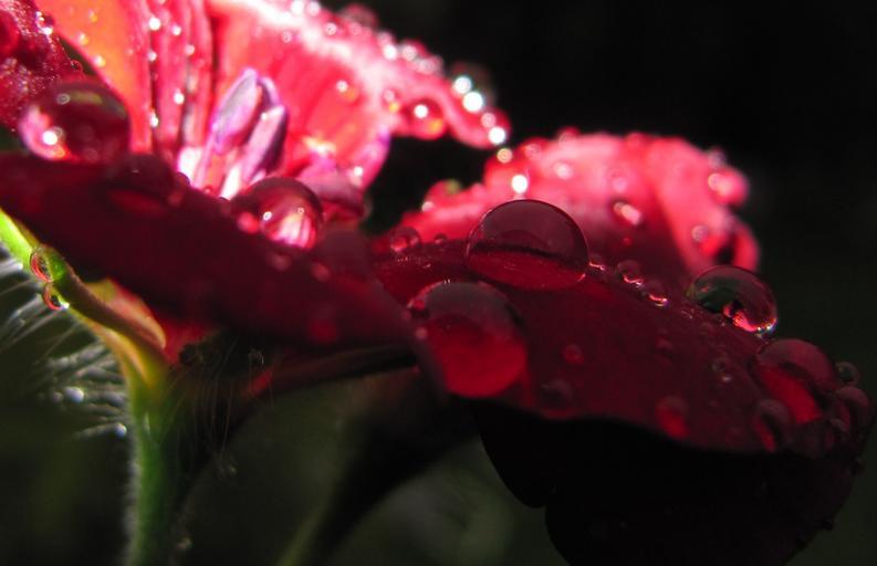Keywords: drip flower blossom bloom red geranium water flash dark