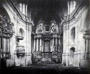| Keywords: Drohiczyn bened1875.jpg pl Wykonana w 1875 roku fotografia ołtarza głównego ambony i ołtarzy bocznych w kościele sióstr benedyktynek w Drohiczynie Wnętrze to zostało zniszczone przez Rosjan w 1940 roku The main altar the pulpit and the side altars in the church of the Benedictine Sisters in Drohiczyn Poland The interior was destroyed by the Russians in 1940 Photography from 1875 2012-10-20 23 33 38 Dolinami rzek 1875 Creator Zygmunt Gloger 52 395833 22 649722 Custom license marker 2012 10 21 PD-old-100 All Saints church in Drohiczyn Baroque altars in Poland Baroque altars destroyed in Poland during World War II Black and white photographs of Drohiczyn |