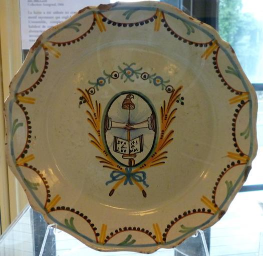 Keywords: Droits de l'homme assiette.jpg en The decor symbolises the declaration of the human rights on August 26 1789 Subjects are union and liberty The union is represented by the handshake a symbol that was inspired by freemasony over an open book on which we can see the words droit de lhomm misspelled 'human rights' Liberty is represented by a Phrygian cap on an épée own Stanzilla Anonymous ~ 1790 Faience of Nevers on the French Revolution Plates of France 1790 works in France Faience in the Musée des Beaux-Arts de Bernay Cc-zero |
