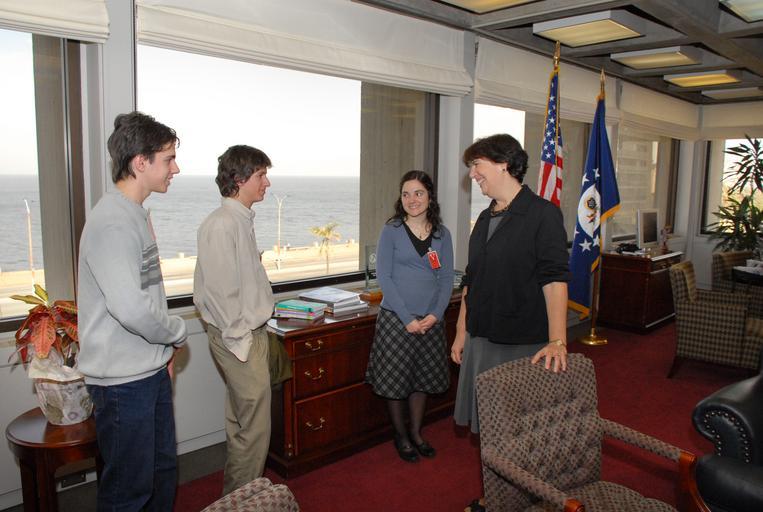 | Keywords: mataojo video contest concurso faraldo fabini matthewman solis indoor Sebastián y Santiago Faraldo del Liceo Cuna de Fabini, Solís de Mataojo, acompañados por su profesora de Biología Carmen García son felicitados por la Encargada de Negocios de los Estados Unidos Robin Matthewman. Sebastián y Santiago son integrantes del grupo de estudiantes Solis Films, creativo del cortometraje ganador del concurso de video sobre el medio ambiente organizado por la embajada. [U.S. Embassy photo by Vince Alongi / Copyright info] Sebastián y Santiago Faraldo del Liceo Cuna de Fabini, Solís de Mataojo, acompañados por su profesora de Biología Carmen García son felicitados por la Encargada de Negocios de los Estados Unidos Robin Matthewman. Sebastián y Santiago son integrantes del grupo de estudiantes Solis Films, creativo del cortometraje ganador del concurso de video sobre el medio ambiente organizado por la embajada. [U.S. Embassy photo by Vince Alongi / Copyright info] |