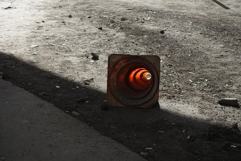 Keywords: cone traffic_cone trafficcone gray orange orange_on_gray orangeongray ground sunlight contrast outdoor