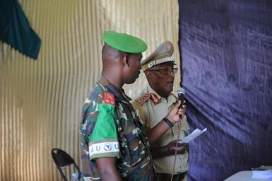 Keywords: SNA General, General Mohamud Hasan, General Silas Ntigurirwa, speaks at a ceremony to mark the rotation of 78 of his troops back home to Burundi. AMISOM Photo SNA General, General Mohamud Hasan, General Silas Ntigurirwa, speaks at a ceremony to mark the rotation of 78 of his troops back home to Burundi. AMISOM Photo