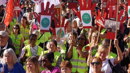 Keywords: omprioriteringsbidrag kommunalt oprør kommunaltoprør københavn copenhagen demonstration protest velfærd welfare denmark budgetcuts nedskæringer velfærdsalliance fagforening union signs hand hands hånd outdoor