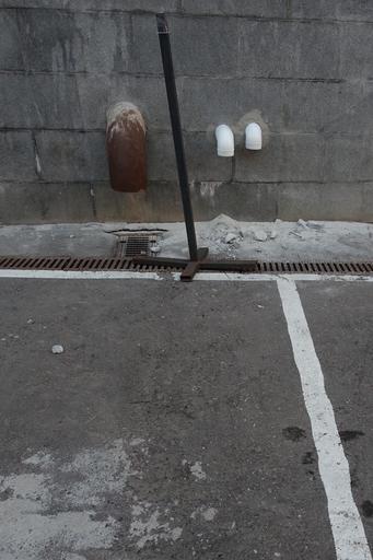 Keywords: cropped pipes gray asphalt dirt geometry rather_minimal ratherminimal signpost office