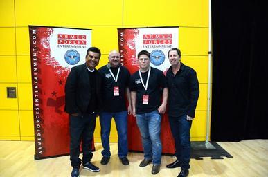 Keywords: indoor ANSBACH, Germany (May 20, 2015) -- Comedians George Lopez and Bryan Kellen visited U.S. Army Garrison Ansbach for a stand-up comedy show Tuesday at the Katterbach Fitness Center. The show, presented by Armed Forces Entertainment and titled “George Lopez: Grunt by Association,” played to an audience of approximately 1,500 USAG Ansbach community members. Before the show, Lopez and Kellen toured a hangar and the flightline of Katterbach Army Airfield with Soldiers of the 12th Combat Aviation Brigade. After the show, Lopez and Kellen stayed to take photos with fans of the show. (U.S. Army photo by Stephen Baack, USAG Ansbach Public Affairs) ANSBACH, Germany (May 20, 2015) -- Comedians George Lopez and Bryan Kellen visited U.S. Army Garrison Ansbach for a stand-up comedy show Tuesday at the Katterbach Fitness Center. The show, presented by Armed Forces Entertainment and titled “George Lopez: Grunt by Association,” played to an audience of approximately 1,500 USAG Ansbach community members. Before the show, Lopez and Kellen toured a hangar and the flightline of Katterbach Army Airfield with Soldiers of the 12th Combat Aviation Brigade. After the show, Lopez and Kellen stayed to take photos with fans of the show. (U.S. Army photo by Stephen Baack, USAG Ansbach Public Affairs)