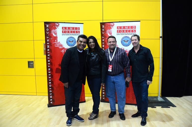 | Keywords: indoor ANSBACH, Germany (May 20, 2015) -- Comedians George Lopez and Bryan Kellen visited U.S. Army Garrison Ansbach for a stand-up comedy show Tuesday at the Katterbach Fitness Center. The show, presented by Armed Forces Entertainment and titled “George Lopez: Grunt by Association,” played to an audience of approximately 1,500 USAG Ansbach community members. Before the show, Lopez and Kellen toured a hangar and the flightline of Katterbach Army Airfield with Soldiers of the 12th Combat Aviation Brigade. After the show, Lopez and Kellen stayed to take photos with fans of the show. (U.S. Army photo by Stephen Baack, USAG Ansbach Public Affairs) ANSBACH, Germany (May 20, 2015) -- Comedians George Lopez and Bryan Kellen visited U.S. Army Garrison Ansbach for a stand-up comedy show Tuesday at the Katterbach Fitness Center. The show, presented by Armed Forces Entertainment and titled “George Lopez: Grunt by Association,” played to an audience of approximately 1,500 USAG Ansbach community members. Before the show, Lopez and Kellen toured a hangar and the flightline of Katterbach Army Airfield with Soldiers of the 12th Combat Aviation Brigade. After the show, Lopez and Kellen stayed to take photos with fans of the show. (U.S. Army photo by Stephen Baack, USAG Ansbach Public Affairs) |