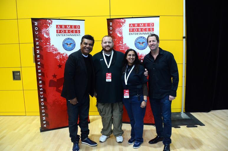 | Keywords: indoor ANSBACH, Germany (May 20, 2015) -- Comedians George Lopez and Bryan Kellen visited U.S. Army Garrison Ansbach for a stand-up comedy show Tuesday at the Katterbach Fitness Center. The show, presented by Armed Forces Entertainment and titled “George Lopez: Grunt by Association,” played to an audience of approximately 1,500 USAG Ansbach community members. Before the show, Lopez and Kellen toured a hangar and the flightline of Katterbach Army Airfield with Soldiers of the 12th Combat Aviation Brigade. After the show, Lopez and Kellen stayed to take photos with fans of the show. (U.S. Army photo by Stephen Baack, USAG Ansbach Public Affairs) ANSBACH, Germany (May 20, 2015) -- Comedians George Lopez and Bryan Kellen visited U.S. Army Garrison Ansbach for a stand-up comedy show Tuesday at the Katterbach Fitness Center. The show, presented by Armed Forces Entertainment and titled “George Lopez: Grunt by Association,” played to an audience of approximately 1,500 USAG Ansbach community members. Before the show, Lopez and Kellen toured a hangar and the flightline of Katterbach Army Airfield with Soldiers of the 12th Combat Aviation Brigade. After the show, Lopez and Kellen stayed to take photos with fans of the show. (U.S. Army photo by Stephen Baack, USAG Ansbach Public Affairs) |