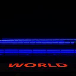 Keywords: hip_to_crop_square hiptocropsquare world neon neon_lights neonlights blue red blue_on_black blueonblack red_on_black redonblack sign the_world_is_yours theworldisyours cropped black background text