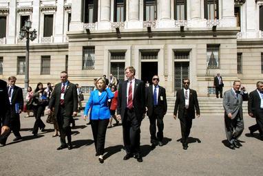 | Keywords: clinton mujica nelson uruguay outdoor Secretary of State Hillary Clinton and U.S. Ambassador to Uruguay David D. Nelson leaving the Legislative Palace, following their meeting with President-elect José Mujica. [State Department photo by Vince Alongi / Public Domain] Secretary of State Hillary Clinton and U.S. Ambassador to Uruguay David D. Nelson leaving the Legislative Palace, following their meeting with President-elect José Mujica. [State Department photo by Vince Alongi / Public Domain] |