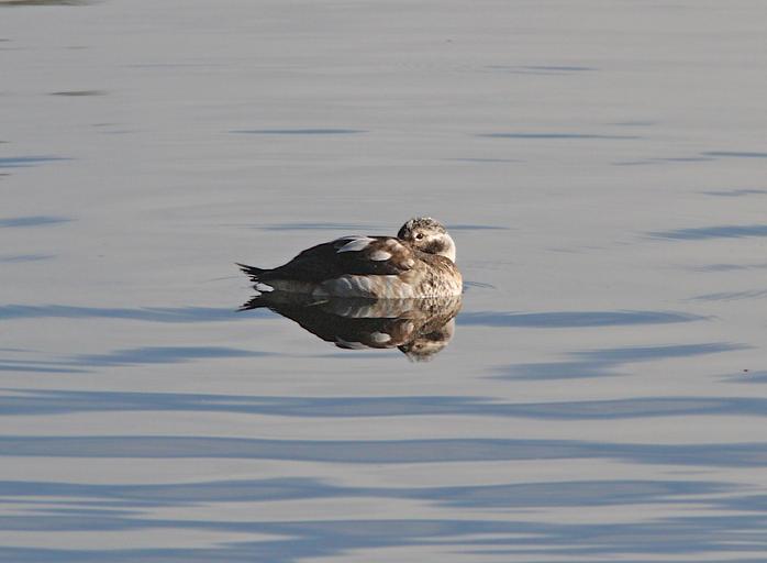 Keywords: outdoor animal bird When first posted I had thought that this bird was an adult male. Doing more research, I now feel that it was a HY male in "supplemental 1" plumage or there-about. Primary reason being the amount of brown in the face and flanks and breast. I think that in an adult male in molt that the mix would be black and white, not brown and white. And although the bill of an adult male might be all gray at this time of year, I think that this is more likely of an imm bird. The following is copied from NA Birds: "Alternate I Plumage Prealternate I molt begins in Oct and continues to mid-Dec. Timing known only for male, assumed to be similar for female (Palmer 1976). Partial molt; Juvenal wing and Basic I tail and belly retained. Male. A less well-defined version of Definitive Alternate male plumage. Gray patch around eye more brown and less well defined, loral-patch dark brown (not black). Breast has smaller and less crisp black band than in Definitive Alternate. Back a mixture of black and white feathers; scapulars gray to white. Sides and flanks light gray, belly white." Robertson, Gregory J. and Jean-Pierre L. Savard. 2002. Long-tailed Duck (Clangula hyemalis), The Birds of North America Online (A. Poole, Ed.). Ithaca: Cornell Lab of Ornithology; Retrieved from the Birds of North America Online: bna.birds.cornell.edu/bna/species/651 doi:10.2173/bna.651 When first posted I had thought that this bird was an adult male. Doing more research, I now feel that it was a HY male in "supplemental 1" plumage or there-about. Primary reason being the amount of brown in the face and flanks and breast. I think that in an adult male in molt that the mix would be black and white, not brown and white. And although the bill of an adult male might be all gray at this time of year, I think that this is more likely of an imm bird. The following is copied from NA Birds: "Alternate I Plumage Prealternate I molt begins in Oct and continues to mid-Dec. Timing known only for male, assumed to be similar for female (Palmer 1976). Partial molt; Juvenal wing and Basic I tail and belly retained. Male. A less well-defined version of Definitive Alternate male plumage. Gray patch around eye more brown and less well defined, loral-patch dark brown (not black). Breast has smaller and less crisp black band than in Definitive Alternate. Back a mixture of black and white feathers; scapulars gray to white. Sides and flanks light gray, belly white." Robertson, Gregory J. and Jean-Pierre L. Savard. 2002. Long-tailed Duck (Clangula hyemalis), The Birds of North America Online (A. Poole, Ed.). Ithaca: Cornell Lab of Ornithology; Retrieved from the Birds of North America Online: bna.birds.cornell.edu/bna/species/651 doi:10.2173/bna.651 |