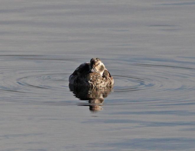 Keywords: outdoor animal When first posted I had thought that this bird was an adult male. Doing more research, I now feel that it was a HY male in "supplemental 1" plumage or there-about. Primary reason being the amount of brown in the face and flanks and breast. I think that in an adult male in molt that the mix would be black and white, not brown and white. And although the bill of an adult male might be all gray at this time of year, I think that this is more likely of an imm bird. The following is copied from NA Birds: "Alternate I Plumage Prealternate I molt begins in Oct and continues to mid-Dec. Timing known only for male, assumed to be similar for female (Palmer 1976). Partial molt; Juvenal wing and Basic I tail and belly retained. Male. A less well-defined version of Definitive Alternate male plumage. Gray patch around eye more brown and less well defined, loral-patch dark brown (not black). Breast has smaller and less crisp black band than in Definitive Alternate. Back a mixture of black and white feathers; scapulars gray to white. Sides and flanks light gray, belly white." Robertson, Gregory J. and Jean-Pierre L. Savard. 2002. Long-tailed Duck (Clangula hyemalis), The Birds of North America Online (A. Poole, Ed.). Ithaca: Cornell Lab of Ornithology; Retrieved from the Birds of North America Online: bna.birds.cornell.edu/bna/species/651 doi:10.2173/bna.651 When first posted I had thought that this bird was an adult male. Doing more research, I now feel that it was a HY male in "supplemental 1" plumage or there-about. Primary reason being the amount of brown in the face and flanks and breast. I think that in an adult male in molt that the mix would be black and white, not brown and white. And although the bill of an adult male might be all gray at this time of year, I think that this is more likely of an imm bird. The following is copied from NA Birds: "Alternate I Plumage Prealternate I molt begins in Oct and continues to mid-Dec. Timing known only for male, assumed to be similar for female (Palmer 1976). Partial molt; Juvenal wing and Basic I tail and belly retained. Male. A less well-defined version of Definitive Alternate male plumage. Gray patch around eye more brown and less well defined, loral-patch dark brown (not black). Breast has smaller and less crisp black band than in Definitive Alternate. Back a mixture of black and white feathers; scapulars gray to white. Sides and flanks light gray, belly white." Robertson, Gregory J. and Jean-Pierre L. Savard. 2002. Long-tailed Duck (Clangula hyemalis), The Birds of North America Online (A. Poole, Ed.). Ithaca: Cornell Lab of Ornithology; Retrieved from the Birds of North America Online: bna.birds.cornell.edu/bna/species/651 doi:10.2173/bna.651 |