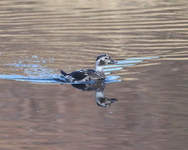 Keywords: outdoor When first posted I had thought that this bird was an adult male. Doing more research, I now feel that it was a HY male in "supplemental 1" plumage or there-about. Primary reason being the amount of brown in the face and flanks and breast. I think that in an adult male in molt that the mix would be black and white, not brown and white. And although the bill of an adult male might be all gray at this time of year, I think that this is more likely of an imm bird. The following is copied from NA Birds: "Alternate I Plumage Prealternate I molt begins in Oct and continues to mid-Dec. Timing known only for male, assumed to be similar for female (Palmer 1976). Partial molt; Juvenal wing and Basic I tail and belly retained. Male. A less well-defined version of Definitive Alternate male plumage. Gray patch around eye more brown and less well defined, loral-patch dark brown (not black). Breast has smaller and less crisp black band than in Definitive Alternate. Back a mixture of black and white feathers; scapulars gray to white. Sides and flanks light gray, belly white." Robertson, Gregory J. and Jean-Pierre L. Savard. 2002. Long-tailed Duck (Clangula hyemalis), The Birds of North America Online (A. Poole, Ed.). Ithaca: Cornell Lab of Ornithology; Retrieved from the Birds of North America Online: bna.birds.cornell.edu/bna/species/651 doi:10.2173/bna.651 When first posted I had thought that this bird was an adult male. Doing more research, I now feel that it was a HY male in "supplemental 1" plumage or there-about. Primary reason being the amount of brown in the face and flanks and breast. I think that in an adult male in molt that the mix would be black and white, not brown and white. And although the bill of an adult male might be all gray at this time of year, I think that this is more likely of an imm bird. The following is copied from NA Birds: "Alternate I Plumage Prealternate I molt begins in Oct and continues to mid-Dec. Timing known only for male, assumed to be similar for female (Palmer 1976). Partial molt; Juvenal wing and Basic I tail and belly retained. Male. A less well-defined version of Definitive Alternate male plumage. Gray patch around eye more brown and less well defined, loral-patch dark brown (not black). Breast has smaller and less crisp black band than in Definitive Alternate. Back a mixture of black and white feathers; scapulars gray to white. Sides and flanks light gray, belly white." Robertson, Gregory J. and Jean-Pierre L. Savard. 2002. Long-tailed Duck (Clangula hyemalis), The Birds of North America Online (A. Poole, Ed.). Ithaca: Cornell Lab of Ornithology; Retrieved from the Birds of North America Online: bna.birds.cornell.edu/bna/species/651 doi:10.2173/bna.651
