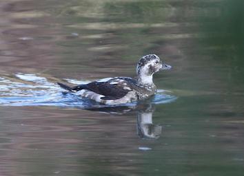 Keywords: outdoor animal bird aquatic bird When first posted I had thought that this bird was an adult male. Doing more research, I now feel that it was a HY male in "supplemental 1" plumage or there-about. Primary reason being the amount of brown in the face and flanks and breast. I think that in an adult male in molt that the mix would be black and white, not brown and white. And although the bill of an adult male might be all gray at this time of year, I think that this is more likely of an imm bird. The following is copied from NA Birds: "Alternate I Plumage Prealternate I molt begins in Oct and continues to mid-Dec. Timing known only for male, assumed to be similar for female (Palmer 1976). Partial molt; Juvenal wing and Basic I tail and belly retained. Male. A less well-defined version of Definitive Alternate male plumage. Gray patch around eye more brown and less well defined, loral-patch dark brown (not black). Breast has smaller and less crisp black band than in Definitive Alternate. Back a mixture of black and white feathers; scapulars gray to white. Sides and flanks light gray, belly white." Robertson, Gregory J. and Jean-Pierre L. Savard. 2002. Long-tailed Duck (Clangula hyemalis), The Birds of North America Online (A. Poole, Ed.). Ithaca: Cornell Lab of Ornithology; Retrieved from the Birds of North America Online: bna.birds.cornell.edu/bna/species/651 doi:10.2173/bna.651 When first posted I had thought that this bird was an adult male. Doing more research, I now feel that it was a HY male in "supplemental 1" plumage or there-about. Primary reason being the amount of brown in the face and flanks and breast. I think that in an adult male in molt that the mix would be black and white, not brown and white. And although the bill of an adult male might be all gray at this time of year, I think that this is more likely of an imm bird. The following is copied from NA Birds: "Alternate I Plumage Prealternate I molt begins in Oct and continues to mid-Dec. Timing known only for male, assumed to be similar for female (Palmer 1976). Partial molt; Juvenal wing and Basic I tail and belly retained. Male. A less well-defined version of Definitive Alternate male plumage. Gray patch around eye more brown and less well defined, loral-patch dark brown (not black). Breast has smaller and less crisp black band than in Definitive Alternate. Back a mixture of black and white feathers; scapulars gray to white. Sides and flanks light gray, belly white." Robertson, Gregory J. and Jean-Pierre L. Savard. 2002. Long-tailed Duck (Clangula hyemalis), The Birds of North America Online (A. Poole, Ed.). Ithaca: Cornell Lab of Ornithology; Retrieved from the Birds of North America Online: bna.birds.cornell.edu/bna/species/651 doi:10.2173/bna.651 |