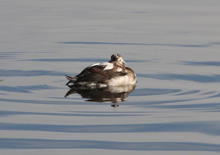Keywords: outdoor animal bird When first posted I had thought that this bird was an adult male. Doing more research, I now feel that it was a HY male in "supplemental 1" plumage or there-about. Primary reason being the amount of brown in the face and flanks and breast. I think that in an adult male in molt that the mix would be black and white, not brown and white. And although the bill of an adult male might be all gray at this time of year, I think that this is more likely of an imm bird. The following is copied from NA Birds: "Alternate I Plumage Prealternate I molt begins in Oct and continues to mid-Dec. Timing known only for male, assumed to be similar for female (Palmer 1976). Partial molt; Juvenal wing and Basic I tail and belly retained. Male. A less well-defined version of Definitive Alternate male plumage. Gray patch around eye more brown and less well defined, loral-patch dark brown (not black). Breast has smaller and less crisp black band than in Definitive Alternate. Back a mixture of black and white feathers; scapulars gray to white. Sides and flanks light gray, belly white." Robertson, Gregory J. and Jean-Pierre L. Savard. 2002. Long-tailed Duck (Clangula hyemalis), The Birds of North America Online (A. Poole, Ed.). Ithaca: Cornell Lab of Ornithology; Retrieved from the Birds of North America Online: bna.birds.cornell.edu/bna/species/651 doi:10.2173/bna.651 When first posted I had thought that this bird was an adult male. Doing more research, I now feel that it was a HY male in "supplemental 1" plumage or there-about. Primary reason being the amount of brown in the face and flanks and breast. I think that in an adult male in molt that the mix would be black and white, not brown and white. And although the bill of an adult male might be all gray at this time of year, I think that this is more likely of an imm bird. The following is copied from NA Birds: "Alternate I Plumage Prealternate I molt begins in Oct and continues to mid-Dec. Timing known only for male, assumed to be similar for female (Palmer 1976). Partial molt; Juvenal wing and Basic I tail and belly retained. Male. A less well-defined version of Definitive Alternate male plumage. Gray patch around eye more brown and less well defined, loral-patch dark brown (not black). Breast has smaller and less crisp black band than in Definitive Alternate. Back a mixture of black and white feathers; scapulars gray to white. Sides and flanks light gray, belly white." Robertson, Gregory J. and Jean-Pierre L. Savard. 2002. Long-tailed Duck (Clangula hyemalis), The Birds of North America Online (A. Poole, Ed.). Ithaca: Cornell Lab of Ornithology; Retrieved from the Birds of North America Online: bna.birds.cornell.edu/bna/species/651 doi:10.2173/bna.651