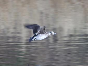 Keywords: outdoor animal When first posted I had thought that this bird was an adult male. Doing more research, I now feel that it was a HY male in "supplemental 1" plumage or there-about. Primary reason being the amount of brown in the face and flanks and breast. I think that in an adult male in molt that the mix would be black and white, not brown and white. And although the bill of an adult male might be all gray at this time of year, I think that this is more likely of an imm bird. The following is copied from NA Birds: "Alternate I Plumage Prealternate I molt begins in Oct and continues to mid-Dec. Timing known only for male, assumed to be similar for female (Palmer 1976). Partial molt; Juvenal wing and Basic I tail and belly retained. Male. A less well-defined version of Definitive Alternate male plumage. Gray patch around eye more brown and less well defined, loral-patch dark brown (not black). Breast has smaller and less crisp black band than in Definitive Alternate. Back a mixture of black and white feathers; scapulars gray to white. Sides and flanks light gray, belly white." Robertson, Gregory J. and Jean-Pierre L. Savard. 2002. Long-tailed Duck (Clangula hyemalis), The Birds of North America Online (A. Poole, Ed.). Ithaca: Cornell Lab of Ornithology; Retrieved from the Birds of North America Online: bna.birds.cornell.edu/bna/species/651 doi:10.2173/bna.651 When first posted I had thought that this bird was an adult male. Doing more research, I now feel that it was a HY male in "supplemental 1" plumage or there-about. Primary reason being the amount of brown in the face and flanks and breast. I think that in an adult male in molt that the mix would be black and white, not brown and white. And although the bill of an adult male might be all gray at this time of year, I think that this is more likely of an imm bird. The following is copied from NA Birds: "Alternate I Plumage Prealternate I molt begins in Oct and continues to mid-Dec. Timing known only for male, assumed to be similar for female (Palmer 1976). Partial molt; Juvenal wing and Basic I tail and belly retained. Male. A less well-defined version of Definitive Alternate male plumage. Gray patch around eye more brown and less well defined, loral-patch dark brown (not black). Breast has smaller and less crisp black band than in Definitive Alternate. Back a mixture of black and white feathers; scapulars gray to white. Sides and flanks light gray, belly white." Robertson, Gregory J. and Jean-Pierre L. Savard. 2002. Long-tailed Duck (Clangula hyemalis), The Birds of North America Online (A. Poole, Ed.). Ithaca: Cornell Lab of Ornithology; Retrieved from the Birds of North America Online: bna.birds.cornell.edu/bna/species/651 doi:10.2173/bna.651 |