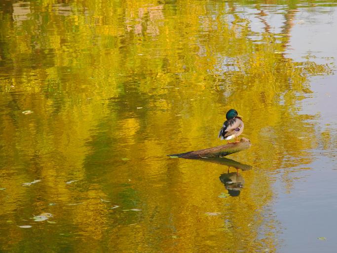 Keywords: duck reflection water shine nature animal tree autumn yellow drake wild
