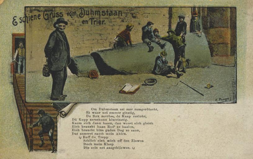 | Keywords: Duhmstaan Trier.jpg  Trierer Domsteins gemalt von K Runge und dem Duhmstaan-Gedicht von Julius Friedrich Bernards Gedicht <poem> Om Duhmstaan sei mehr romgerötscht Et war net emmer ginstig De Box zerröss de Kaap verlohr Dä Kopp zerschonn blutrinstig Kaom eich dann haam dao wosst eich gleich Ei braucht kaan Red'ze haalen Eich braucht blus guden Dag ze soan Dat anneret saoth mein Ahlen Roff de Trepp Schlich eich mich off den Ziewen Doch mein Kleep Die sein net ausgebliewen </poem> Cathedrale of Trier http //www zeno org/Ansichtskarten/M/Trier +Rheinland-Pfalz/Duhmstaan Zeno org - Zenodot Verlagsgesellschaft mbH Kunst- und Verlagsanstalt chaar Dathe Komm -Ges a Akt Trier uploaded by Tomukas Dieses Werk ist nach unserer Meinung frei von Rechten Dritter Vor einer weiteren Verwertung ist unbedingt zu überprüfen ob diese Auffassung haltbar ist da Zenodot jegliche Haftung ablehnt und ausdrücklich nicht von möglichen Ansprüchen Dritter freistellt Für den Fall einer Bestätigung unserer Auffassung gilt Dieser Inhalt darf als Einzelwerk oder Werkbestandteil - auch zu kommerziellen und gewerblichen Zwecken - kopiert verbreitet öffentlich wiedergegeben und Dritten zugänglich gemacht werden Wir bitten darum auf die Herkunft des Inhaltes wie folgt hinzuweisen Quelle http //www zeno org - Zenodot Verlagsgesellschaft mbH Copyright-Vermerke Marken oder andere Rechtsvorbehalte Dritter dürfen nicht entfernt werden According to our opinion this work is free of third party rights Before any further utilisation it is imperative to examine whether this assessment can be maintained as Zenodot refuses any liability and does expressly not indemnify from potential claims by third parties In case of a confirmation of our assessment the following shall apply These contents may be copied disseminated publicly reproduced and be made available to third parties as an individual work or as part of a work - also for business or commercial purposes We ask you to refer to the origin of such contents as follows Source http //www zeno org - Zenodot Verlagsgesellschaft mbH Copyright notes trademarks or other reservations of rights by third parties may not be deleted Cathedral of St Peter Trier Trierisch Postcards of people in Germany PD-old Images from zeno org |