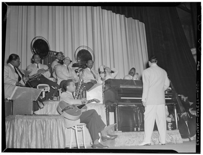 Keywords: Duke Ellington, Junior Raglin, Juan Tizol, Barney Bigard, Ben Webster, Harry Carney, Rex William Stewart, and Sonny Greer, between 1938 and 1948 (William P. Gottlieb 11101).jpg en from left to right Joe Nanton Johnny Hodges Sonny Greer Barney Bigard up Fred Guy down Ben Webster Otto Hardwick Harry Carney Duke Ellington back Junior Raglin or Jimmie Blanton probably between 1940 and 1942 Photograph by William P Gottlieb http //lcweb2 loc gov/diglib/ihas/loc natlib gottlieb 11101/enlarge html page 1 section ver01 size 1024 from Creator William P Gottlieb PD-Gottlieb Photographs by William P Gottlieb Duke Ellington Ben Webster Harry Carney Bandleaders Johnny Hodges Junior Raglin Otto Hardwick Rex Stewart |