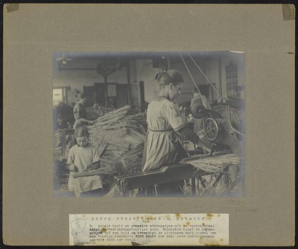 | Keywords: nationaal archief nationaal archief nationaalarchief iconclass:n=47h6 factory straw kinderarbeid child labor childlabor meisjes girls Beschrijving:  Meisjes in de Dutch Straw Works Company (de strohulzenfabriek) te Helmond. Het ene meisje haalt de stromatjes uit de naaimachine, de andere buigt de matjes tot huls en bevestigt de uiteinden door middel van een touwtje. De productie ligt op gemiddeld 3000 stuks per dag  Datum: Onbekend  Vervaardiger: J.D. Filarski  Formaat: 17.5 x 23.5 cm  Bestanddeelnummer: 2.24.03_2256_256-1579  Fotocollectie: Arbeidsinspectie  Auteursrechten: Nationaal Archief  Voor meer informatie over het Nationaal Archief: www.nationaalarchief.nl  Voor meer foto's uit deze en andere collecties, bezoek onze Beeldbank: beeldbank.nationaalarchief.nl/  U kunt ons helpen onze kennis van de fotocollecties te verrijken door tags en commentaren toe te voegen. Herkent u mensen of locaties of heeft u een bijzonder verhaal te vertellen bij één van de foto’s, laat dan een reactie achter (als u ingelogd bent bij Flickr) of stuur een mailtje naar: flickrthecommons@nationaalarchief.nl!   Beschrijving:  Meisjes in de Dutch Straw Works Company (de strohulzenfabriek) te Helmond. Het ene meisje haalt de stromatjes uit de naaimachine, de andere buigt de matjes tot huls en bevestigt de uiteinden door middel van een touwtje. De productie ligt op gemiddeld 3000 stuks per dag  Datum: Onbekend  Vervaardiger: J.D. Filarski  Formaat: 17.5 x 23.5 cm  Bestanddeelnummer: 2.24.03_2256_256-1579  Fotocollectie: Arbeidsinspectie  Auteursrechten: Nationaal Archief  Voor meer informatie over het Nationaal Archief: www.nationaalarchief.nl  Voor meer foto's uit deze en andere collecties, bezoek onze Beeldbank: beeldbank.nationaalarchief.nl/  U kunt ons helpen onze kennis van de fotocollecties te verrijken door tags en commentaren toe te voegen. Herkent u mensen of locaties of heeft u een bijzonder verhaal te vertellen bij één van de foto’s, laat dan een reactie achter (als u ingelogd bent bij Flickr) of stuur een mailtje naar: flickrthecommons@nationaalarchief.nl!    |