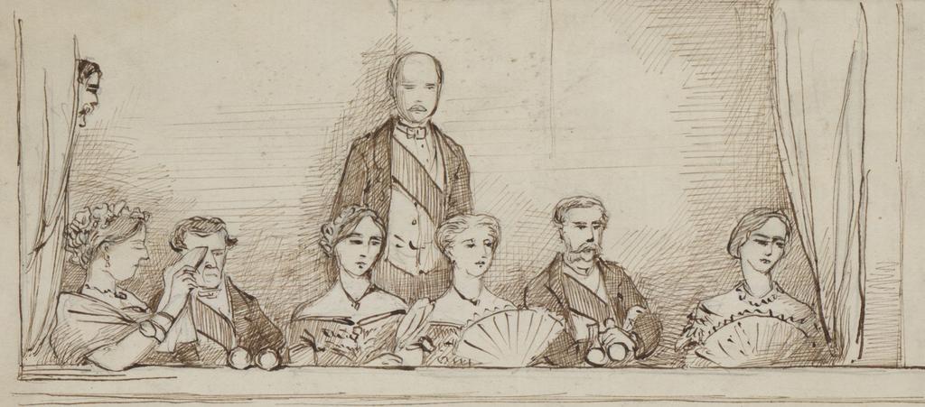 | Keywords: DV307 no.41 - Queen Victoria and other Royals watching Fra Diavolo (opera) July 1857.png Artwork en Left to Right Queen Victoria Leopold I of Belgium Princess Charlotte of Belgium Prince Albert standing Victoria Princess Royal Friedrich Crown Prince of Prussia Lady Frances Jocelyn A sketch of European Royalty watching Fra Diovolo at the opera Probably in London This was sketched in the same month that Princess Charlotte of Belgium married Archduke Maximilian of Austria in Brussels From a sketchbook by Francis Elizabeth Wynne of Voelas and Cefnamlwch in North Wales July 1857 38 x 28 cm volume size Institution National Library of Wales Drawing Volume DV307 object history credit line accession number 1211796 Cc-zero thumb left Royals at the Opera showing labels NLW Drawing volume DV307 Images uploaded as part of NLW - WMUK collaboration Fra Diavolo Victoria of the United Kingdom in art Albert Prince Consort Leopold I of Belgium Frances Jocelyn Viscountess Jocelyn Friedrich III of Germany Charlotte of Belgium Empress of Mexico Victoria Princess Royal Frances Elizabeth Wynne |