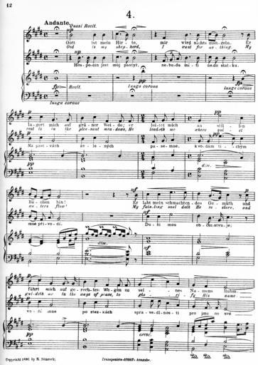 | Keywords: Dvorak's Biblicke Pisne i-12.jpg  Dvorak's_Biblicke_Pisne_i- jpg 11 13 Antonín Dvořák's Biblícké Písně Biblical Songs Op 99 1884 Book 1 containing Songs 1-5 While Dvorak later orchestrated the work this the complete original piano-and-voice version While the massacre of the original music to fit the German and English is appalling it does contain the original Czech and the original music for the Czech The German and English should probably be considered only as a translation This is the first five songs out of ten the other five are printed in a second volume I have not yet tracked down I haven't been able to find Book 2 unfortunately 1895 copy in my own possession The only copyright claimed on the sheet music itself is to N Simrock which is a publishing house Antonín Dvořák 1841 1904 PD-Old Original Czech From http //music ibiblio org/pub/multimedia/pandora/vorbis/contrib/Marta_Chaloupka_Live/Czech notes accompanying the Pandora Music recording 1 Psalm 97 2-6 Oblak a mrákota jest vůkol Něho spravedlnost a soud základ trůnu Jeho Oheň předchází jej a zapaluje vůkol nepřátele Jeho Zasvěcujíť se po okršlku světa blýskání Jeho; to vidouc země děsí se Hory jako vosk rozplývají se před obličejem Hospodina panovníka vší země a slávu jeho spatřují všichni národové 2 Psalms 119 114-117 119 120 Skrýše má a pavéza má Ty jsi na slovo Tvé očekávám Odstuptež ode mne nešlechetníci abych ostříhal přikázaní Boha svého Posiluj mne bych zachován byl a patřil k ustanovením Tvým ustavičně Děsí se strachem před Tebou tělo mé; nebo soudů Tvých bojím se náramně 3 Psams 55 1 2 4/5 6 7 8 Slyš ó Bože Slyš modlitbu mou a neskrývej se před prosbou mou Pozoruj a vyslyš mne neboť naříkám v úpění svém a kormoutím se Srdce mé tesklí ve mně a strachové smrti přišli na mne a hrůza přikvačila mne I řekl jsem Ó bych měl křídla jako holubice zaletěl bych a poodpočinul Aj daleko bych se vzdálil a přebýval bych na poušti Pospíšil bych ujíti větru prudkému a vichřici 4 Psalms 23 1-4 Hospodin jest můj pastýř nebudu míti nedostatku Na pastvách zelených pase mne k vodám tichým mne přivodí Duši mou občerstvuje vodí mne po stezkách spravedlnosti pro jméno své Byť mi se dostalo jíti přes údolí stínu smrti nebuduť se báti zlého nebo Ty se mnou jsi; a prut Tvůj a hůl Tvá toť mne potěšuje 5 Psalms 144 9 145 1-3 5 6 Bože Bože píseň novou zpívati budu Tobě na loutně a žalmy tobě prozpěvovati Na každý den dobrořečiti budu Tobě a chváliti jméno Tvé na věky věků Hospodin jistě veliký jest a vší chvály hodný a velikost jeho nemůž vystižena býti O slávě a kráse a velebnosti Tvé i o věcech Tvých předivných mluviti budu A moc přehrozných skutků Tvých vsichni rozhlašovati budou; i já důstojnost Tvou budu vypravovati 6 Psalms 61 1 3 4 63 1 4/5 Slyš ó Bože volání mé pozoruj modlitby mé Nebo jsi býval útočiště mé a pevná věže před tváří nepřítele Buduť bydliti v stánku tvém na věky schráním se v skrýši křídel tvých Bože Bůh silný můj ty jsi tebeť hned v jitře hledám Tebe žízní duše má po tobě touží tělo mé v zemi žíznivé a vyprahlé v níž není vody A tak abych tobě dobrořečil a s radostným rtů prozpěvováním chválila by tě ústa má 7 Psalms 137 1-5 Při řekách Babylonských tam jsme sedávali a plakávali rozpomínajíce se na Sion Na vrbí v té zemi zavěšovali jsme citary své když se tam dotazovali nás ti kteříž nás zajali na slova písničky říkajíce Zpívejte nám některou píseň Sionskou Odpovídali jsme Kterakž bychom mohli zpívati píseň Hospodinovu v zemi cizozemců Jestliže se zapomenu na tebe ó Jeruzaléme ó zapomeniž i pravice má umění svého 8 Psalms 25 16-18 20 Popatřiž na mne a smiluj se nade mnou neboť jsem opuštěný a strápený Soužení srdce mého rozmnožují se z úzkostí mých vyveď mne z úzkostí mých vyveď mne Smiluj se nade mnou Viz trápení mé a bídu mou a odpusť všecky hříchy mé Ostříhej duše mé a vytrhni mne ať nejsem zahanben neboť v tebe doufám neboť v tebe doufám 9 Psalms 121 1-4 Pozdvihuji očí svých k horám odkud by mi přišla pomoc Pomoc má jest od Hospodina kterýž učinil nebe i zemi Nedopustíť aby se pohnouti měla noha tvá nebo nedřímeť strážný tvůj Aj nedřímeť ovšem nespí ten kterýž ostříhá Izraele 10 Psalms 98 1 4/5 7 8 96 12/11 Zpívejte Hospodinu píseň novou neboť jest divné věci učinil Zvuk vydejte prozpěvujte a žalmy zpívejte Zvuč moře i to což v něm jest okršlek světa i ti což na něm bydlí Řeky rukama plésejte spolu s nimi i hory prozpěvujte Plésej pole a vše což na něm plésej země zvuč i moře i což v něm jest Biblické písně Psalm 23 |
