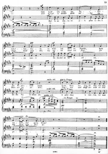 Keywords: Dvorak's Biblicke Pisne i-13.jpg Dvorak's_Biblicke_Pisne_i- jpg 12 14 Antonín Dvořák's Biblícké Písně Biblical Songs Op 99 1884 Book 1 containing Songs 1-5 While Dvorak later orchestrated the work this the complete original piano-and-voice version While the massacre of the original music to fit the German and English is appalling it does contain the original Czech and the original music for the Czech The German and English should probably be considered only as a translation This is the first five songs out of ten the other five are printed in a second volume I have not yet tracked down I haven't been able to find Book 2 unfortunately 1895 copy in my own possession The only copyright claimed on the sheet music itself is to N Simrock which is a publishing house Antonín Dvořák 1841 1904 PD-Old Original Czech From http //music ibiblio org/pub/multimedia/pandora/vorbis/contrib/Marta_Chaloupka_Live/Czech notes accompanying the Pandora Music recording 1 Psalm 97 2-6 Oblak a mrákota jest vůkol Něho spravedlnost a soud základ trůnu Jeho Oheň předchází jej a zapaluje vůkol nepřátele Jeho Zasvěcujíť se po okršlku světa blýskání Jeho; to vidouc země děsí se Hory jako vosk rozplývají se před obličejem Hospodina panovníka vší země a slávu jeho spatřují všichni národové 2 Psalms 119 114-117 119 120 Skrýše má a pavéza má Ty jsi na slovo Tvé očekávám Odstuptež ode mne nešlechetníci abych ostříhal přikázaní Boha svého Posiluj mne bych zachován byl a patřil k ustanovením Tvým ustavičně Děsí se strachem před Tebou tělo mé; nebo soudů Tvých bojím se náramně 3 Psams 55 1 2 4/5 6 7 8 Slyš ó Bože Slyš modlitbu mou a neskrývej se před prosbou mou Pozoruj a vyslyš mne neboť naříkám v úpění svém a kormoutím se Srdce mé tesklí ve mně a strachové smrti přišli na mne a hrůza přikvačila mne I řekl jsem Ó bych měl křídla jako holubice zaletěl bych a poodpočinul Aj daleko bych se vzdálil a přebýval bych na poušti Pospíšil bych ujíti větru prudkému a vichřici 4 Psalms 23 1-4 Hospodin jest můj pastýř nebudu míti nedostatku Na pastvách zelených pase mne k vodám tichým mne přivodí Duši mou občerstvuje vodí mne po stezkách spravedlnosti pro jméno své Byť mi se dostalo jíti přes údolí stínu smrti nebuduť se báti zlého nebo Ty se mnou jsi; a prut Tvůj a hůl Tvá toť mne potěšuje 5 Psalms 144 9 145 1-3 5 6 Bože Bože píseň novou zpívati budu Tobě na loutně a žalmy tobě prozpěvovati Na každý den dobrořečiti budu Tobě a chváliti jméno Tvé na věky věků Hospodin jistě veliký jest a vší chvály hodný a velikost jeho nemůž vystižena býti O slávě a kráse a velebnosti Tvé i o věcech Tvých předivných mluviti budu A moc přehrozných skutků Tvých vsichni rozhlašovati budou; i já důstojnost Tvou budu vypravovati 6 Psalms 61 1 3 4 63 1 4/5 Slyš ó Bože volání mé pozoruj modlitby mé Nebo jsi býval útočiště mé a pevná věže před tváří nepřítele Buduť bydliti v stánku tvém na věky schráním se v skrýši křídel tvých Bože Bůh silný můj ty jsi tebeť hned v jitře hledám Tebe žízní duše má po tobě touží tělo mé v zemi žíznivé a vyprahlé v níž není vody A tak abych tobě dobrořečil a s radostným rtů prozpěvováním chválila by tě ústa má 7 Psalms 137 1-5 Při řekách Babylonských tam jsme sedávali a plakávali rozpomínajíce se na Sion Na vrbí v té zemi zavěšovali jsme citary své když se tam dotazovali nás ti kteříž nás zajali na slova písničky říkajíce Zpívejte nám některou píseň Sionskou Odpovídali jsme Kterakž bychom mohli zpívati píseň Hospodinovu v zemi cizozemců Jestliže se zapomenu na tebe ó Jeruzaléme ó zapomeniž i pravice má umění svého 8 Psalms 25 16-18 20 Popatřiž na mne a smiluj se nade mnou neboť jsem opuštěný a strápený Soužení srdce mého rozmnožují se z úzkostí mých vyveď mne z úzkostí mých vyveď mne Smiluj se nade mnou Viz trápení mé a bídu mou a odpusť všecky hříchy mé Ostříhej duše mé a vytrhni mne ať nejsem zahanben neboť v tebe doufám neboť v tebe doufám 9 Psalms 121 1-4 Pozdvihuji očí svých k horám odkud by mi přišla pomoc Pomoc má jest od Hospodina kterýž učinil nebe i zemi Nedopustíť aby se pohnouti měla noha tvá nebo nedřímeť strážný tvůj Aj nedřímeť ovšem nespí ten kterýž ostříhá Izraele 10 Psalms 98 1 4/5 7 8 96 12/11 Zpívejte Hospodinu píseň novou neboť jest divné věci učinil Zvuk vydejte prozpěvujte a žalmy zpívejte Zvuč moře i to což v něm jest okršlek světa i ti což na něm bydlí Řeky rukama plésejte spolu s nimi i hory prozpěvujte Plésej pole a vše což na něm plésej země zvuč i moře i což v něm jest Biblické písně Psalm 23 |