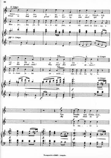 Keywords: Dvorak's Biblicke Pisne i-16.jpg Dvorak's_Biblicke_Pisne_i- jpg 15 17 Antonín Dvořák's Biblícké Písně Biblical Songs Op 99 1884 Book 1 containing Songs 1-5 While Dvorak later orchestrated the work this the complete original piano-and-voice version While the massacre of the original music to fit the German and English is appalling it does contain the original Czech and the original music for the Czech The German and English should probably be considered only as a translation This is the first five songs out of ten the other five are printed in a second volume I have not yet tracked down I haven't been able to find Book 2 unfortunately 1895 copy in my own possession The only copyright claimed on the sheet music itself is to N Simrock which is a publishing house Antonín Dvořák 1841 1904 PD-Old Original Czech From http //music ibiblio org/pub/multimedia/pandora/vorbis/contrib/Marta_Chaloupka_Live/Czech notes accompanying the Pandora Music recording 1 Psalm 97 2-6 Oblak a mrákota jest vůkol Něho spravedlnost a soud základ trůnu Jeho Oheň předchází jej a zapaluje vůkol nepřátele Jeho Zasvěcujíť se po okršlku světa blýskání Jeho; to vidouc země děsí se Hory jako vosk rozplývají se před obličejem Hospodina panovníka vší země a slávu jeho spatřují všichni národové 2 Psalms 119 114-117 119 120 Skrýše má a pavéza má Ty jsi na slovo Tvé očekávám Odstuptež ode mne nešlechetníci abych ostříhal přikázaní Boha svého Posiluj mne bych zachován byl a patřil k ustanovením Tvým ustavičně Děsí se strachem před Tebou tělo mé; nebo soudů Tvých bojím se náramně 3 Psams 55 1 2 4/5 6 7 8 Slyš ó Bože Slyš modlitbu mou a neskrývej se před prosbou mou Pozoruj a vyslyš mne neboť naříkám v úpění svém a kormoutím se Srdce mé tesklí ve mně a strachové smrti přišli na mne a hrůza přikvačila mne I řekl jsem Ó bych měl křídla jako holubice zaletěl bych a poodpočinul Aj daleko bych se vzdálil a přebýval bych na poušti Pospíšil bych ujíti větru prudkému a vichřici 4 Psalms 23 1-4 Hospodin jest můj pastýř nebudu míti nedostatku Na pastvách zelených pase mne k vodám tichým mne přivodí Duši mou občerstvuje vodí mne po stezkách spravedlnosti pro jméno své Byť mi se dostalo jíti přes údolí stínu smrti nebuduť se báti zlého nebo Ty se mnou jsi; a prut Tvůj a hůl Tvá toť mne potěšuje 5 Psalms 144 9 145 1-3 5 6 Bože Bože píseň novou zpívati budu Tobě na loutně a žalmy tobě prozpěvovati Na každý den dobrořečiti budu Tobě a chváliti jméno Tvé na věky věků Hospodin jistě veliký jest a vší chvály hodný a velikost jeho nemůž vystižena býti O slávě a kráse a velebnosti Tvé i o věcech Tvých předivných mluviti budu A moc přehrozných skutků Tvých vsichni rozhlašovati budou; i já důstojnost Tvou budu vypravovati 6 Psalms 61 1 3 4 63 1 4/5 Slyš ó Bože volání mé pozoruj modlitby mé Nebo jsi býval útočiště mé a pevná věže před tváří nepřítele Buduť bydliti v stánku tvém na věky schráním se v skrýši křídel tvých Bože Bůh silný můj ty jsi tebeť hned v jitře hledám Tebe žízní duše má po tobě touží tělo mé v zemi žíznivé a vyprahlé v níž není vody A tak abych tobě dobrořečil a s radostným rtů prozpěvováním chválila by tě ústa má 7 Psalms 137 1-5 Při řekách Babylonských tam jsme sedávali a plakávali rozpomínajíce se na Sion Na vrbí v té zemi zavěšovali jsme citary své když se tam dotazovali nás ti kteříž nás zajali na slova písničky říkajíce Zpívejte nám některou píseň Sionskou Odpovídali jsme Kterakž bychom mohli zpívati píseň Hospodinovu v zemi cizozemců Jestliže se zapomenu na tebe ó Jeruzaléme ó zapomeniž i pravice má umění svého 8 Psalms 25 16-18 20 Popatřiž na mne a smiluj se nade mnou neboť jsem opuštěný a strápený Soužení srdce mého rozmnožují se z úzkostí mých vyveď mne z úzkostí mých vyveď mne Smiluj se nade mnou Viz trápení mé a bídu mou a odpusť všecky hříchy mé Ostříhej duše mé a vytrhni mne ať nejsem zahanben neboť v tebe doufám neboť v tebe doufám 9 Psalms 121 1-4 Pozdvihuji očí svých k horám odkud by mi přišla pomoc Pomoc má jest od Hospodina kterýž učinil nebe i zemi Nedopustíť aby se pohnouti měla noha tvá nebo nedřímeť strážný tvůj Aj nedřímeť ovšem nespí ten kterýž ostříhá Izraele 10 Psalms 98 1 4/5 7 8 96 12/11 Zpívejte Hospodinu píseň novou neboť jest divné věci učinil Zvuk vydejte prozpěvujte a žalmy zpívejte Zvuč moře i to což v něm jest okršlek světa i ti což na něm bydlí Řeky rukama plésejte spolu s nimi i hory prozpěvujte Plésej pole a vše což na něm plésej země zvuč i moře i což v něm jest Biblické písně Psalm 144 |