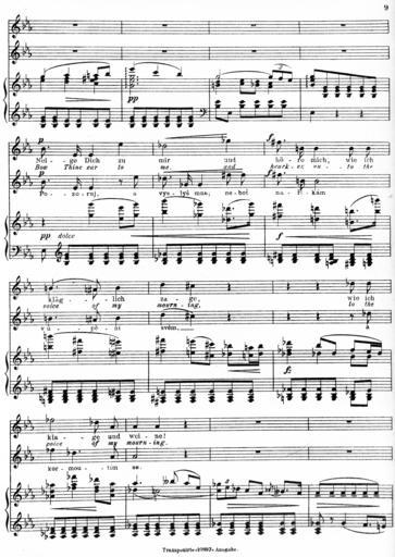| Keywords: Dvorak's Biblicke Pisne i-9.jpg Dvorak's_Biblicke_Pisne_i- jpg 8 10 Antonín Dvořák's Biblícké Písně Biblical Songs Op 99 1884 Book 1 containing Songs 1-5 While Dvorak later orchestrated the work this the complete original piano-and-voice version While the massacre of the original music to fit the German and English is appalling it does contain the original Czech and the original music for the Czech The German and English should probably be considered only as a translation This is the first five songs out of ten the other five are printed in a second volume I have not yet tracked down I haven't been able to find Book 2 unfortunately 1895 copy in my own possession The only copyright claimed on the sheet music itself is to N Simrock which is a publishing house Antonín Dvořák 1841 1904 PD-Old Original Czech From http //music ibiblio org/pub/multimedia/pandora/vorbis/contrib/Marta_Chaloupka_Live/Czech notes accompanying the Pandora Music recording 1 Psalm 97 2-6 Oblak a mrákota jest vůkol Něho spravedlnost a soud základ trůnu Jeho Oheň předchází jej a zapaluje vůkol nepřátele Jeho Zasvěcujíť se po okršlku světa blýskání Jeho; to vidouc země děsí se Hory jako vosk rozplývají se před obličejem Hospodina panovníka vší země a slávu jeho spatřují všichni národové 2 Psalms 119 114-117 119 120 Skrýše má a pavéza má Ty jsi na slovo Tvé očekávám Odstuptež ode mne nešlechetníci abych ostříhal přikázaní Boha svého Posiluj mne bych zachován byl a patřil k ustanovením Tvým ustavičně Děsí se strachem před Tebou tělo mé; nebo soudů Tvých bojím se náramně 3 Psams 55 1 2 4/5 6 7 8 Slyš ó Bože Slyš modlitbu mou a neskrývej se před prosbou mou Pozoruj a vyslyš mne neboť naříkám v úpění svém a kormoutím se Srdce mé tesklí ve mně a strachové smrti přišli na mne a hrůza přikvačila mne I řekl jsem Ó bych měl křídla jako holubice zaletěl bych a poodpočinul Aj daleko bych se vzdálil a přebýval bych na poušti Pospíšil bych ujíti větru prudkému a vichřici 4 Psalms 23 1-4 Hospodin jest můj pastýř nebudu míti nedostatku Na pastvách zelených pase mne k vodám tichým mne přivodí Duši mou občerstvuje vodí mne po stezkách spravedlnosti pro jméno své Byť mi se dostalo jíti přes údolí stínu smrti nebuduť se báti zlého nebo Ty se mnou jsi; a prut Tvůj a hůl Tvá toť mne potěšuje 5 Psalms 144 9 145 1-3 5 6 Bože Bože píseň novou zpívati budu Tobě na loutně a žalmy tobě prozpěvovati Na každý den dobrořečiti budu Tobě a chváliti jméno Tvé na věky věků Hospodin jistě veliký jest a vší chvály hodný a velikost jeho nemůž vystižena býti O slávě a kráse a velebnosti Tvé i o věcech Tvých předivných mluviti budu A moc přehrozných skutků Tvých vsichni rozhlašovati budou; i já důstojnost Tvou budu vypravovati 6 Psalms 61 1 3 4 63 1 4/5 Slyš ó Bože volání mé pozoruj modlitby mé Nebo jsi býval útočiště mé a pevná věže před tváří nepřítele Buduť bydliti v stánku tvém na věky schráním se v skrýši křídel tvých Bože Bůh silný můj ty jsi tebeť hned v jitře hledám Tebe žízní duše má po tobě touží tělo mé v zemi žíznivé a vyprahlé v níž není vody A tak abych tobě dobrořečil a s radostným rtů prozpěvováním chválila by tě ústa má 7 Psalms 137 1-5 Při řekách Babylonských tam jsme sedávali a plakávali rozpomínajíce se na Sion Na vrbí v té zemi zavěšovali jsme citary své když se tam dotazovali nás ti kteříž nás zajali na slova písničky říkajíce Zpívejte nám některou píseň Sionskou Odpovídali jsme Kterakž bychom mohli zpívati píseň Hospodinovu v zemi cizozemců Jestliže se zapomenu na tebe ó Jeruzaléme ó zapomeniž i pravice má umění svého 8 Psalms 25 16-18 20 Popatřiž na mne a smiluj se nade mnou neboť jsem opuštěný a strápený Soužení srdce mého rozmnožují se z úzkostí mých vyveď mne z úzkostí mých vyveď mne Smiluj se nade mnou Viz trápení mé a bídu mou a odpusť všecky hříchy mé Ostříhej duše mé a vytrhni mne ať nejsem zahanben neboť v tebe doufám neboť v tebe doufám 9 Psalms 121 1-4 Pozdvihuji očí svých k horám odkud by mi přišla pomoc Pomoc má jest od Hospodina kterýž učinil nebe i zemi Nedopustíť aby se pohnouti měla noha tvá nebo nedřímeť strážný tvůj Aj nedřímeť ovšem nespí ten kterýž ostříhá Izraele 10 Psalms 98 1 4/5 7 8 96 12/11 Zpívejte Hospodinu píseň novou neboť jest divné věci učinil Zvuk vydejte prozpěvujte a žalmy zpívejte Zvuč moře i to což v něm jest okršlek světa i ti což na něm bydlí Řeky rukama plésejte spolu s nimi i hory prozpěvujte Plésej pole a vše což na něm plésej země zvuč i moře i což v něm jest Biblické písně Psalm 55 Biblické písně Music in 1894 Christianity in the Czech Republic Czech language |