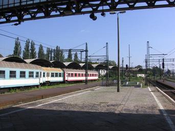 Keywords: Dworzec.Gornoslaski-widok.z.Glownego.jpg Widok z peronu 1 Dworca Głównego we Wrocławiu zabudowania po lewej w głębi jasne budynki Dworca Kolei Górnośląskiej Oberschlesische Eisenbahn ; łukowe dachy znajdują się w przybliżeniu nad miejscem gdzie znajdował się peron tego dworca Own 2007-09-14 Julo Julo Wrocław Górnośląski train station |