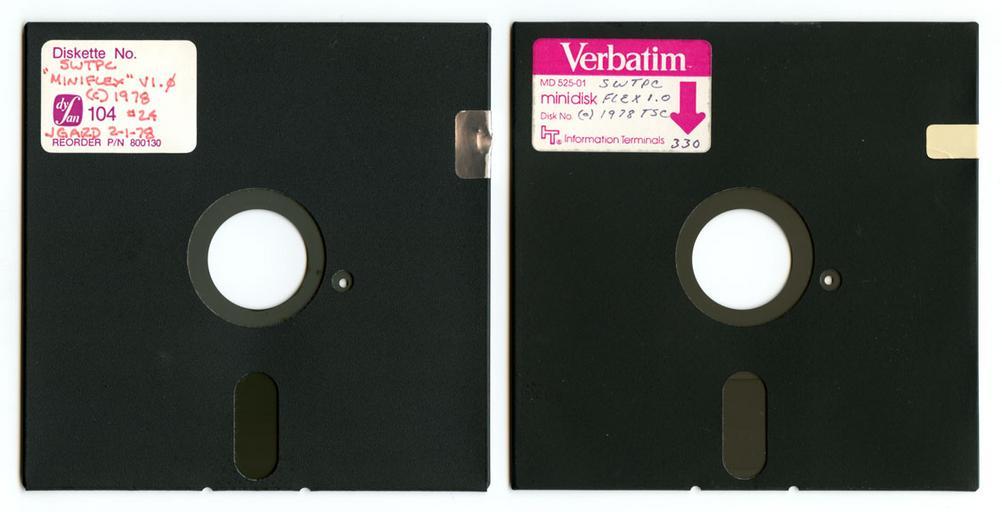 | Keywords: Dysan Verbatim 5.25 disks 1978.jpg  en The diskettes for the Shugart SA-400 Minifloppy were jointly developed by Dysan Corporation and Information Terminals Corporation Storage capacity of the minifloppy diskettes were 109 4 kilobytes unformatted and 89 6 kilobytes formatted When the diskettes were introduced in August 1976 they only supported 35 data tracks this was increased to 40 data tracks in 1977 The software on these disks was developed by Technical System Consultants of West Lafayette Indiana for Southwest Technical Products Corporation of San Antonio Texas It was a disk operating system for the SWTPC 6800 Computer System that used a Motorola M6800 microprocessor The claim of copyright is for the contents of the disk not the hand-written labels These provide a date the disks were first used Disks scanned with an Epson Perfection V500 Photo scanner Own Swtpc6800 en User Swtpc6800 Michael Holley 2010-01-17 <gallery> File Shugart SA 400 Minifloppy Bottom jpg File Shugart SA 400 Minifloppy Drive jpg File Shugart SA 400 Minifloppy Front jpg File Shugart SA 400 Minifloppy Rear jpg File Shugart SA 400 Minifloppy Top jpg File Shugart SA 400 Minifloppy With Disk jpg File Shugart Minifloppy Ad Sept 1977 jpg File Shugart SA 104 Minidiskette jpg File Verbatim 5 25 minidisk tracks 1978 jpg </gallery> Shugart Minifloppy Verbatim Corporation Photographs by User Swtpc6800 Dysan Corp |