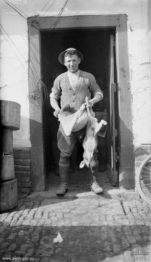 | Keywords: E02268.jpeg en Sergeant J C E Rosengard a sergeant cook of the 3rd Battalion drawing rations of bread and hare from a farmhouse after Strazeele France department of Nord between Sec Bois and Borre which was used as 3rd Battalion Headquarters At this time on account of the rapid evacuation of civilians there were great quantities of flour potatoes and livestock left at farmhouses and the troops defending the area fared well Australian War Memorial Author 1918-04-01 Historical images of Nord Australian Army cc-zero |