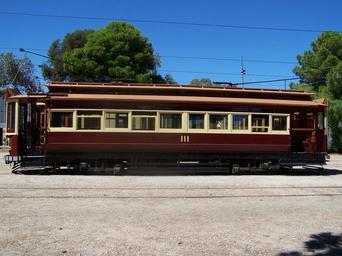 Keywords: E1 111 side profile, March 2009.jpg en Side profile shot of E1 111 as preserved at the St Kilda Tramway Museum The side to the left shows the original saloon while the side to the right of the centre of the tram shows the converted end easily noticable by the smaller size windows March 2009 own William Adams 2009-03-08 Adelaide tramway museum |