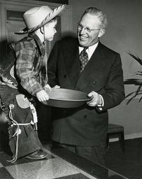 | Keywords: Earl Warren with young miner.jpg California Governor Earl Warren with a small boy dressed as a prospector As this was taken by the California Centennials Commission it was likely part of a Gold Rush centennial celebration California State Archives This is one of the images described http //www sos ca gov/archives/collections/photographs/centennials htm here Its number is VB3 P37 2 ~ 1948 1950 California Centennials Commission other versions PD-CAGov Earl Warren | ||||