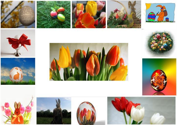 Keywords: easter egg collage spring tulips easter eggs painted hare ostehase easter celebration painting color flowers meadow easter sunday easter monday easter egg