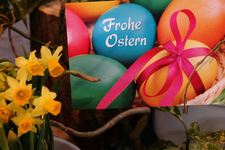 Keywords: easter greeting happy easter easter greeting card easter eggs postcard daffodils colorful eggs colorful easter egg resurrection life eternal