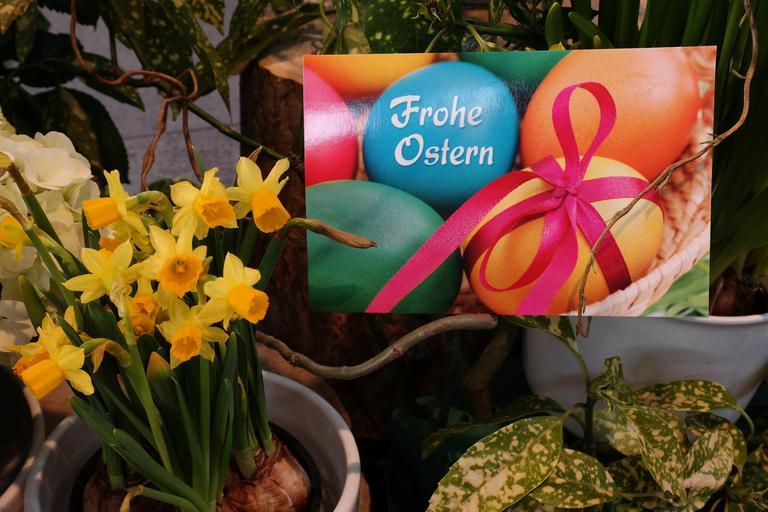 Keywords: easter greeting happy easter easter greeting card easter eggs postcard daffodils colorful eggs colorful easter egg resurrection life eternal