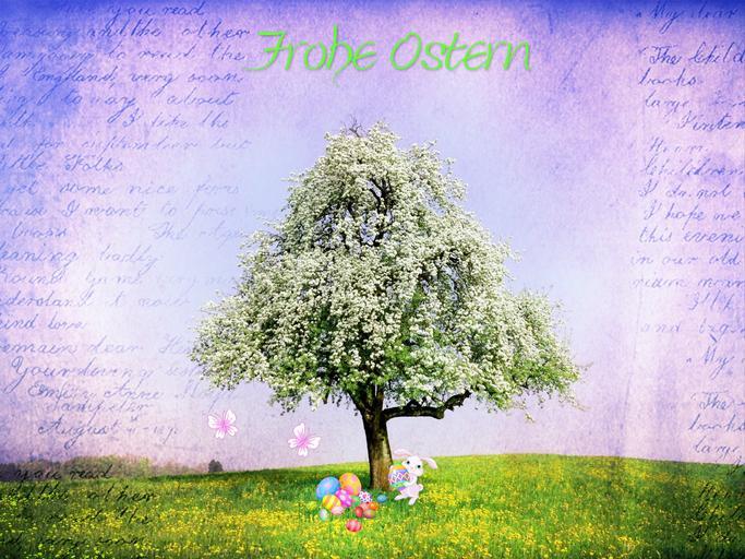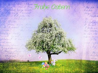 Keywords: easter happy easter greeting card easter greeting spring tree easter eggs easter theme symbol easter bunny meadow egg hare grass green color decorative colorful animal butterflies flowers nature flora plant