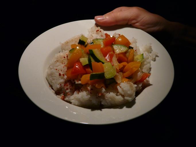 Keywords: eat rice dish paprika zucchini rice plate serve