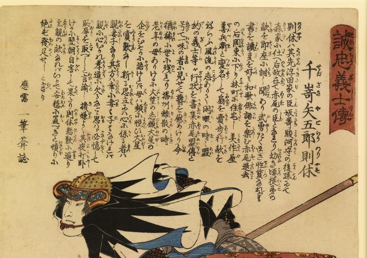 | Keywords: Ebiya Rinnosuke - Seichu gishi den - Walters 9516 - Detail A.jpg  Walters Art Museum artwork Creator Ebiya Rinnosuke Senzaki Yagoro Noriyasu running spear in hand between 1847 1848 late Edo pigments mulberry paper cm 36 2 25 5 accession number 95 16 37577 Mr and Mrs C R Snell Jr date and mode of acquisition unknown Walters Art Museum Gift of Mr and Mrs C R Snell Jr 1986 Signature Ichiyusai Kuniyoshi ga The Nature of Loyalty Japanese Warrior Prints of the Nineteenth Century The Walters Art Gallery Baltimore 1989 place of origin Edo present-day Tokyo Japan Walters Art Museum license 2D Japanese prints in the Walters Art Museum Historic samurai prints Ebiya Rinnosuke Media contributed by the Walters Art Museum needs category review |