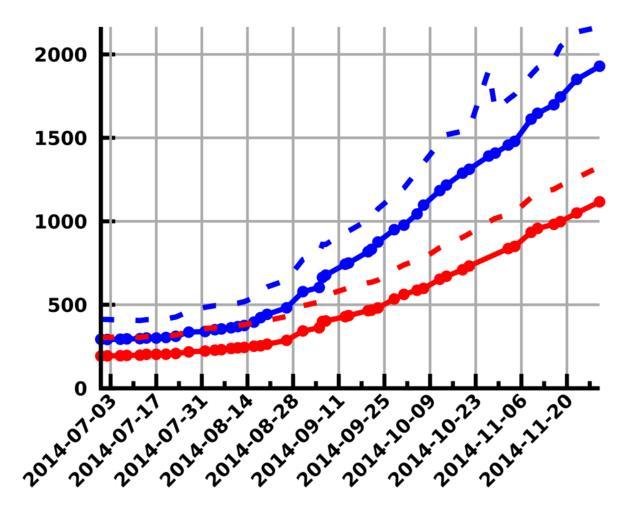 | Keywords: Ebola guinea2014.svg de Ebola in guinea 2014 Blau Bestätige Fälle gestrichelt inkl vermutete Fälle Rot davon Todesfälle gestrichelt inkl vermutete Fälle en Ebola virus disease in Guinea 2014 blue confirmed cases broken line including probable and suspect cases red confirmed deaths broken line including probable and suspect deaths 2014-08-24 19 10 53 own Data http //www who int/csr/don/archive/disease/ebola/en/ http //www who int/csr/disease/ebola/situation-reports/archive/en/ StefanPohl cc-zero v fl gnuplot 5 1 CVS reset set terminal svg size 600 480 fname 'Verdana sans-serif bold' fsize 18 lw 5 unset key set grid lt 1 lc rgb 0xAAAAAA lw 5 set border 3 lw 75 set tics nomirror set xdata time set timefmt ' Y- m- d' set format x ' Y- m- d' set autoscale fix set xtics 60 60 24 14 nomirror rotate by 45 right set for i 1 4 style line i ps 75 pt 7 set style line 1 lc rgb 0x0000FF dt 2 set style line 2 lc rgb 0x0000FF set style line 3 lc rgb 0xFF0000 dt 2 set style line 4 lc rgb 0xFF0000 NA ' ' do fordata in 'ebola_guinea2014 ebola_liberia2014 ebola_sierraleone2014' set output data ' svg' set yrange 0 plot data ' txt' \ u 1 strcol 2 eq NA strcol 3 eq NA strcol 4 eq NA 8 2+ 3+ 4 ls 1 w lines \ u 1 2 ls 2 w linespoints \ u 1 strcol 5 eq NA strcol 6 eq NA strcol 7 eq NA 9 5+ 6+ 7 ls 3 w lines \ u 1 5 ls 4 w linespoints set output data '_log svg' unset yrange set logscale y replot unset logscale y Grafikwerkstatt Uploaded with UploadWizard 2014 Ebola outbreak statistics |