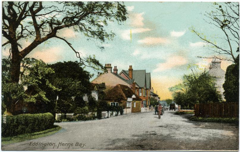 | Keywords: Eddington Kent tinted postcard 002.jpg  Tinted postcard of Eddington Herne Bay Kent England Not postmarked The picture shows the original village or hamlet long before the area became a suburb of Herne Bay Publisher The Wrench series; divided back and printed in Saxony therefore dated before 1914 Most of the buildings in the photo still exist The site is on the east side of the Canterbury Road A299 looking north just north of Priory House at the southern end of Eddington Points of interest The house in the foreground and almost hidden by greenery is in the Kentish vernacular style with limewashed weatherboarding but the taller houses are late Victorian There is no footpath The orange-red roofs of the buildings in the foreground are pan-tiled The low building with double doors and tall chimney in the centre of the picture may have been the forge which is recorded at this crossroads The post office at this crossroads was where the postcards were sold but it is never pictured in this standard view It may have been to the left of the picture behind the hedge in the foreground It is possible that the large vehicle approaching in the distance is the horse-drawn mail coach Scan of original postcard in my possession 1900-1914 anon out of copyright PD-old-70-1923 Historical images of Eddington Kent Postcards of Kent 1900s postcards |