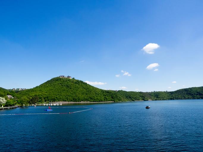 Keywords: edersee castle waldeck water forest green blue sky clouds hesse relaxation holiday germany outdoor pool bathing place bathing establishment