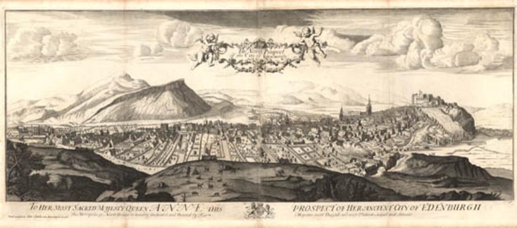 | Keywords: edinburgh scotland calton hill caltonhill edinburgh castle edinburghcastle arthur's seat arthursseat salisbury crags salisburycrags church spires churchspires nls holyrood palace holyroodpalace nor' loch norloch monochrome outdoor blackandwhite black and white This panoramic view of Edinburgh from Calton Hill to the North was probably drafted around 1690. The engraved version here was dedicated to Queen Anne and is referred to as the 'Queen Anne View'. Edinburgh appears here as a long single street, sloping right to left from Edinburgh Castle to the Palace of Holyrood. Salisbury Crags and Arthur's Seat are in the left background. Some of the buildings that dominate the skyline still survive today. To the right of the palace we see Queensberry House (T-shaped), Canongate Church and (with a conical spire) Canongate Tolbooth. The crown spire near the castle belongs to St Giles Cathedral. To the left of it is the spire of the Tron Church. In the lower right foreground, beside Trinity College Church, is the Edinburgh Physic Garden, which had been recently founded. Below the castle is Nor' Loch. This view was not included in Theatrum Scotiae until the 1719 edition. More .... This panoramic view of Edinburgh from Calton Hill to the North was probably drafted around 1690. The engraved version here was dedicated to Queen Anne and is referred to as the 'Queen Anne View'. Edinburgh appears here as a long single street, sloping right to left from Edinburgh Castle to the Palace of Holyrood. Salisbury Crags and Arthur's Seat are in the left background. Some of the buildings that dominate the skyline still survive today. To the right of the palace we see Queensberry House (T-shaped), Canongate Church and (with a conical spire) Canongate Tolbooth. The crown spire near the castle belongs to St Giles Cathedral. To the left of it is the spire of the Tron Church. In the lower right foreground, beside Trinity College Church, is the Edinburgh Physic Garden, which had been recently founded. Below the castle is Nor' Loch. This view was not included in Theatrum Scotiae until the 1719 edition. More .... |
