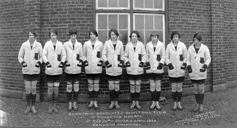 Keywords: basketball women girls sports high school highschool high school sports highschoolsports olympics blackandwhite monochrome team sport sport black and white Caption on photo reads "Commercial Graduates Basketball Club, of Edmonton Alberta, at Toronto Ontario April 1926. Canadian Champions." Photographer is Panoramic Camera Co, 251 Victoria St., Toronto." Left to right: Connie Smith, Dorothy Johnson, Daisy Johnson, Kate MacCrae, Elsie Bennie, Hattie Hopkins, Mildred McCormack, Marguerite Bailey, Margaret MacBurney. A11418. Caption on photo reads "Commercial Graduates Basketball Club, of Edmonton Alberta, at Toronto Ontario April 1926. Canadian Champions." Photographer is Panoramic Camera Co, 251 Victoria St., Toronto." Left to right: Connie Smith, Dorothy Johnson, Daisy Johnson, Kate MacCrae, Elsie Bennie, Hattie Hopkins, Mildred McCormack, Marguerite Bailey, Margaret MacBurney. A11418. |