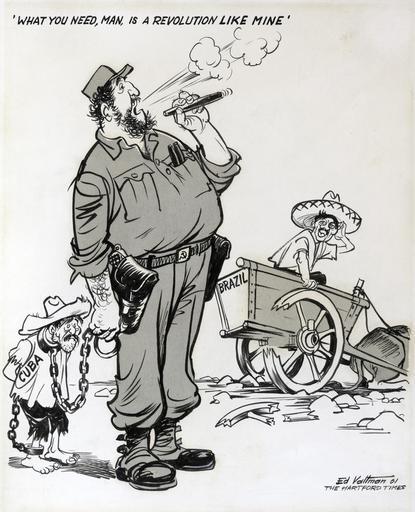 | Keywords: Edmund S. Valtman, What you need is a revolution like mine ppmsca.02969.jpg  en What you need man is a revolution like mine Valtman portrays Fidel Castro 1927- towering above small figures who represent Cuba and Brazil As Castro advises Brazil to have a communist revolution like the one he led Brazil looks back at the Cuban leader in puzzlement perhaps pondering the fate of Cuba in rags and chains Shortages of food and consumer goods were reported in the island nation in late August at the time that Valtman made this drawing At the same time Brazil was facing the economic challenge of debt and a crisis of leadership when Pres Jânio Quadros resigned on August 25th Though Latin American countries that desired social reform initially regarded Castro with sympathy Valtman seems to suggest that Brazil has come to view his example with skepticism LOC-image ppmsca 02969 Edmund S Valtman 1961-08-31 Gifted to the U S Library of Congress by Edmund S Valtman No restrictions of usage according to http //www loc gov/rr/print/res/384_valt html Edmund S Valtman Edmund S Valtman Caricatures of Fidel Castro Personifications of Cuba |